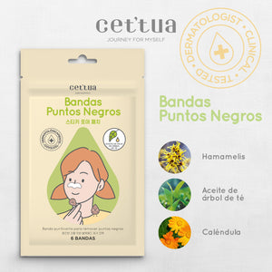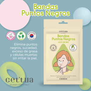 Las Bandas Puntos Negros Cettua diseñado para eliminar puntos negros, exceso de grasa y células muertas sin irritar la piel. Su diseño se ajusta desde el tabique hasta los lados de la nariz, asegurando una eliminación efectiva de impurezas. Formuladas con aceite de árbol de té y caléndula, estas bandas ayudan a reducir el crecimiento de microorganismos, regenerar la piel y promover la producción de colágeno.