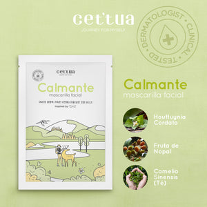 La Mascarilla Facial Calmante Cettua diseñada para calmar y relajar la piel sensible. Formulada con Houttuynia cordata, fruta de nopal y Camellia sinensis (té), esta mascarilla reduce el enrojecimiento, aporta una sensación de frescura y deja la piel suave y confortable.