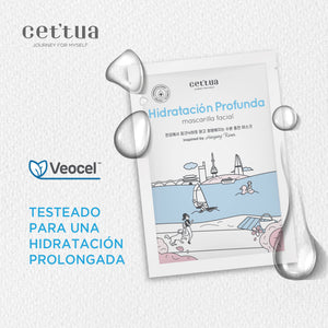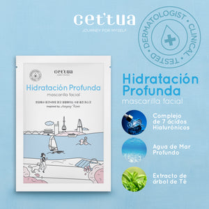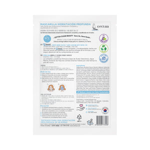 Mascarilla testada para una hidratación prolongada eco amigable y biodegradable, hecha con fibra de iyocell que garantiza una mayor absorción de los componentes en la piel. Formula a base de agua de rápida adsorción con efecto de hidratación de larga duración sin dejar sensación grasosa. contiene complejo de 7 ácidos hialurónicos que conserva y retiene la humedad de la piel, elimina la células muertas gracias al agua de mar profundo y mantiene el equilibrio en la hidratación ya que contiene extracto de árbol de te.