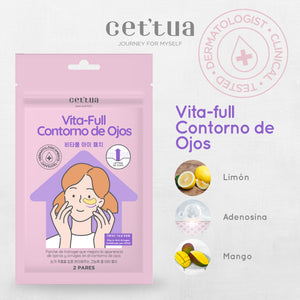 El Vita-Full Contorno de Ojos Cettua es un parche de hidrogel reafirmante y aclarante diseñado para reducir bolsas, líneas de expresión y manchas en el contorno de los ojos. Formulado con vitamina C, extracto de mango y adenosina, este tratamiento promueve la regeneración cutánea, neutraliza los radicales libres y deja la piel más firme y luminosa.